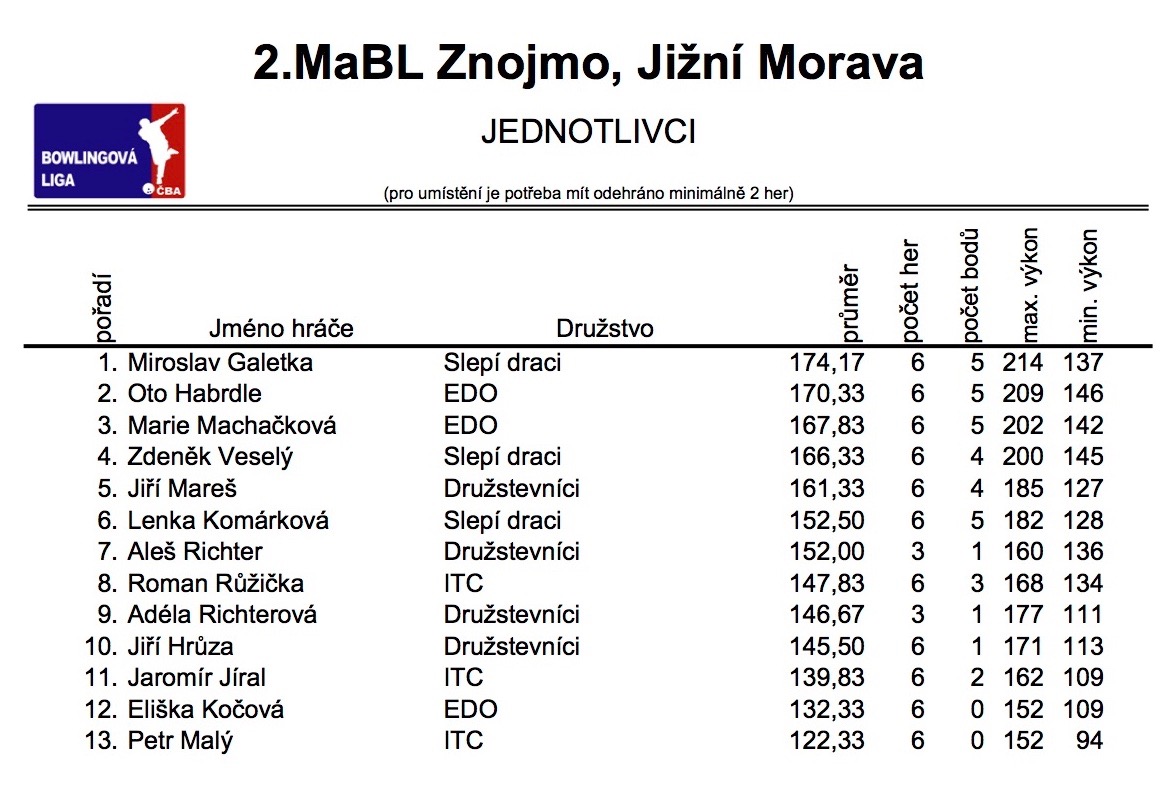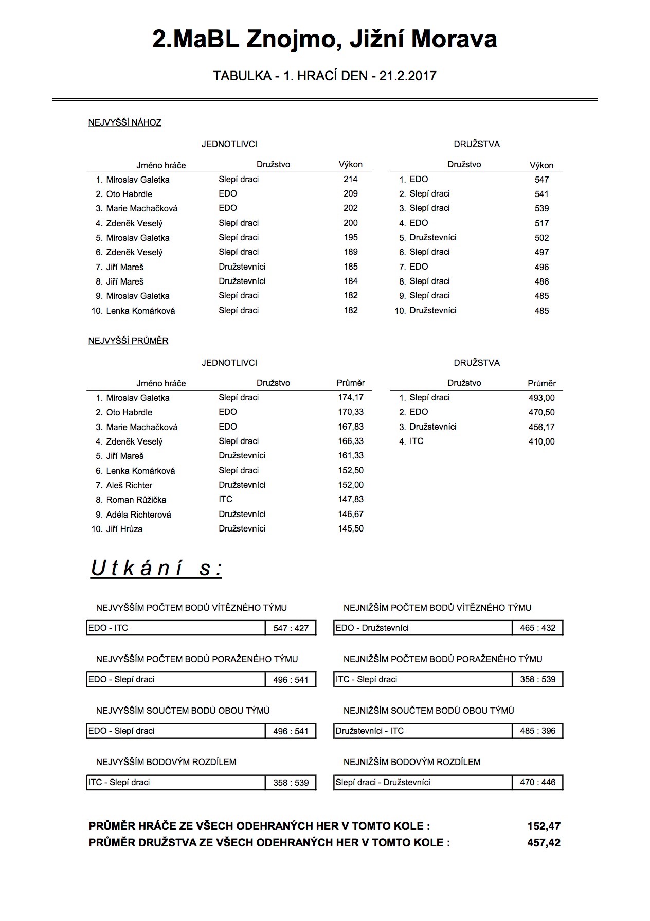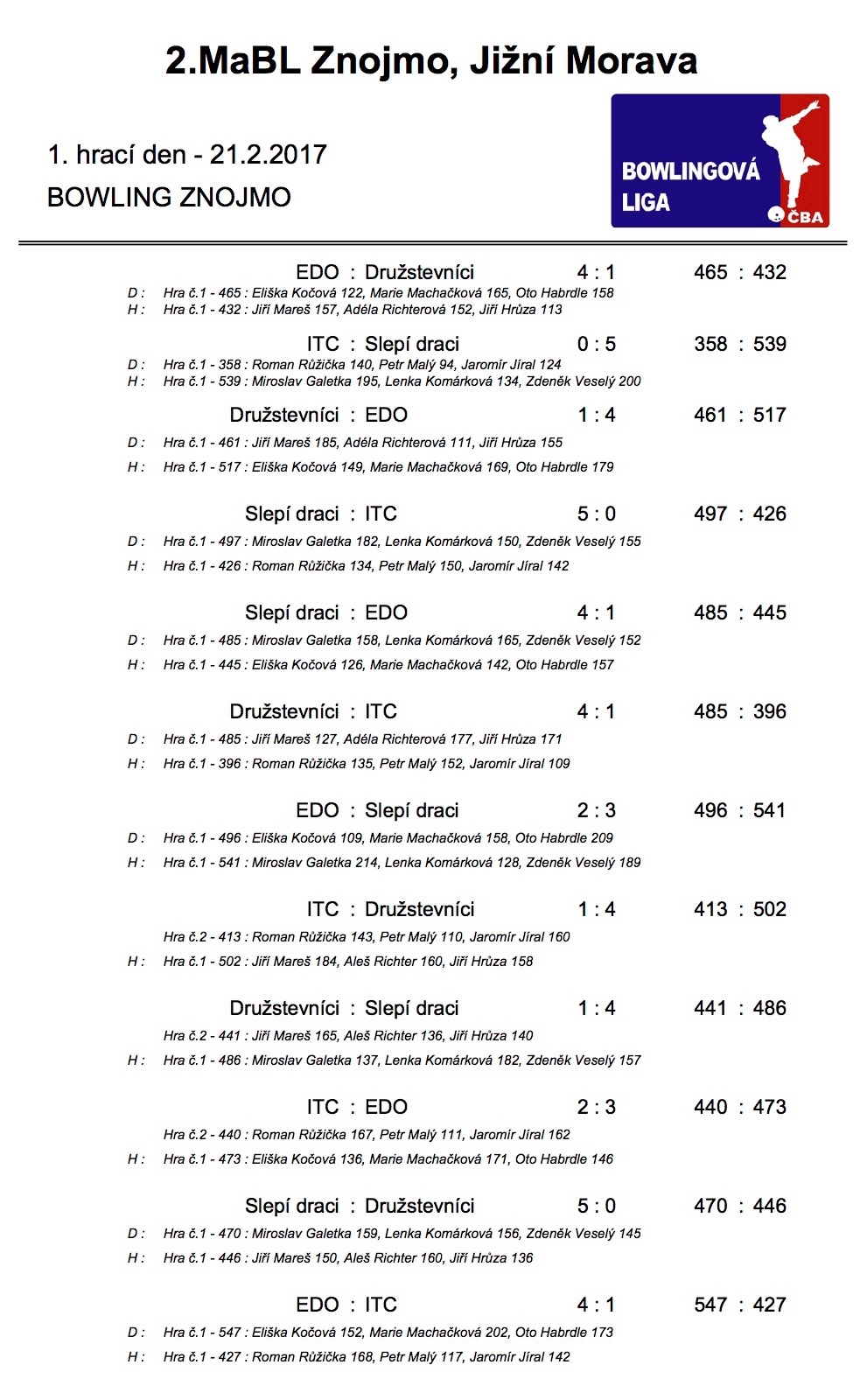V úterý 21.2.2017 odehrála družstva 2. Městské amatérské bowlingové ligy první kolo jarní části ročníku 2017. Výsledky naleznete jako vždy v článku.
