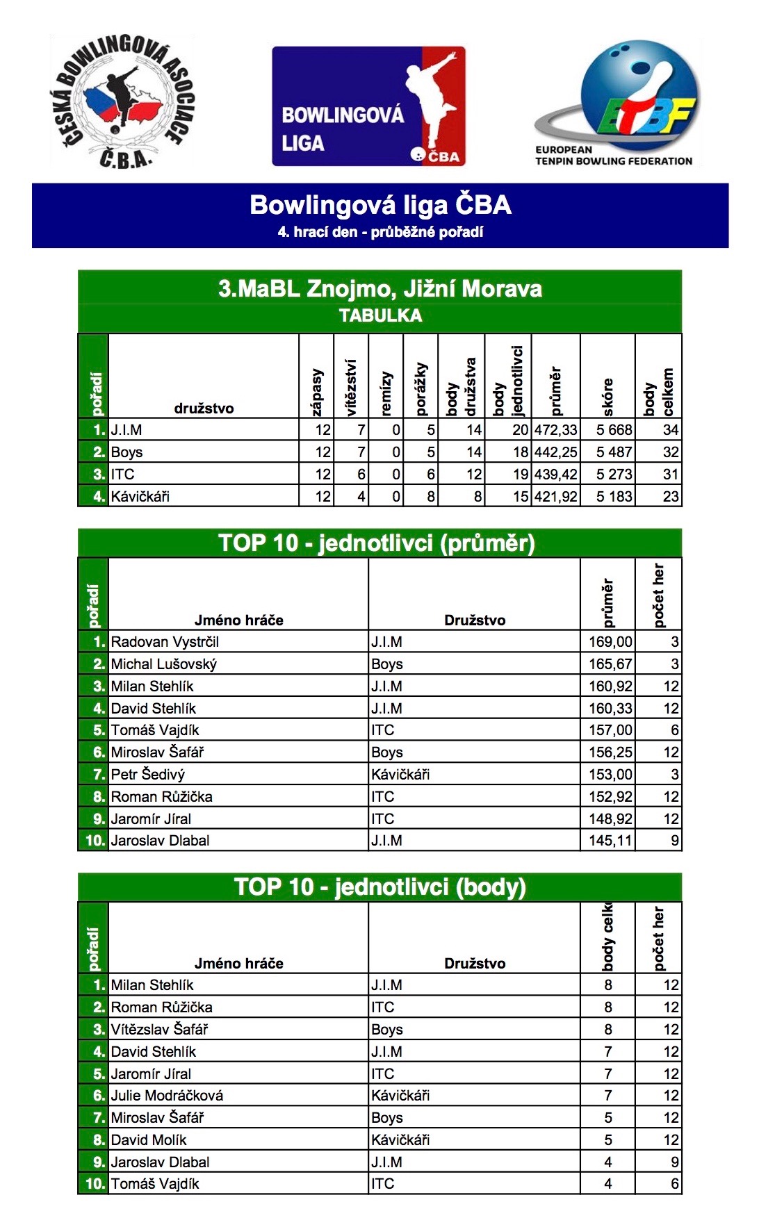 V pondělí 14.11.2016 odehrála družstva 3. Městské amatérské bowlingové ligy čtvrté kolo poodzimní části ročníku 2016. Výsledky naleznete jako vždy v článku.