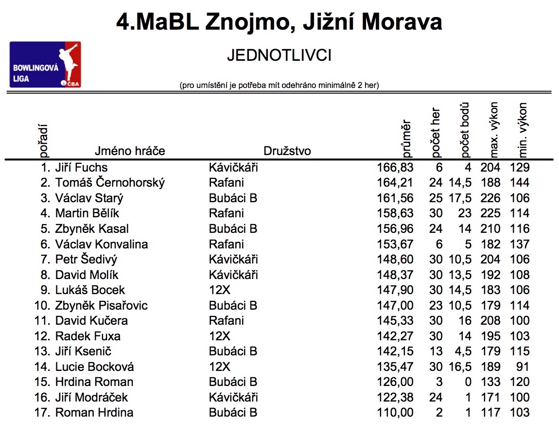 V pondělí 6.11.2017 odehrála také družstva 4. Městské amatérské bowlingové ligy již čtvrté, poslední kolo podzimní části ročníku 2017/2018. Výsledky naleznete jako vždy v článku.